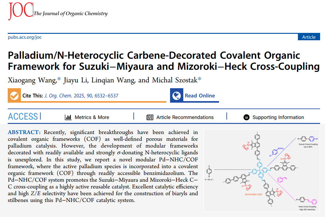 发展稳定高效非均相钯用于催化Suzuki偶联反应一直是绿色化学、有机化学领域研究的热点。汪小钢团队利用氮杂环卡宾作为核心骨架合成了一列具有三维结构的共价有机框架材料,通过后合成策略将金属钯铆钉在共价有机框架上成功制备Pd-NHC-COF催化剂。该催化剂能够在室温条件下实现Suzuki和Heck偶联反应,产率高达90%,并具有优异的Z/E选择性。该工作以“Palladium/N-Heterocyclic Carbene-Decorated Covalent Organci Framework for Suzuki-Miyaura and Mizoroki-Heck Cross-Coupling”为题发表在有机化学领域国际知名期刊The Journal of Organic Chemistry(SCI二区)。