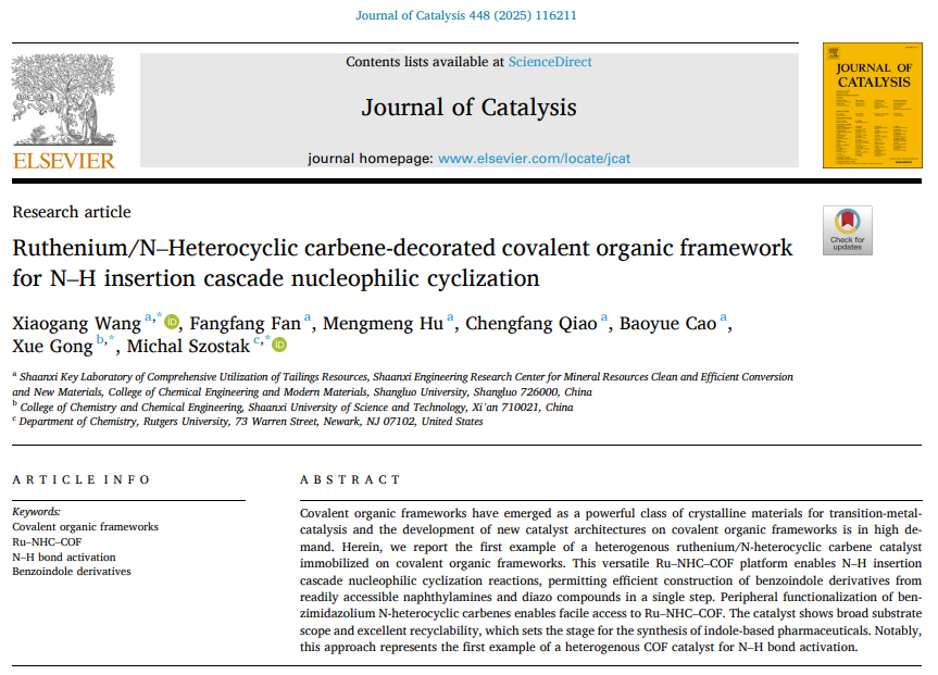 汪小钢团队利用氮杂环卡宾钌作为关键结构单元,通过席夫碱反应成功制备钌氮杂环卡宾共价有机框架材料(Ru-NHC-COF)。所合成Ru-NHC-COF催化剂在催化N-H键插入串联分子内亲核环化反应具有优异的催化效率,DFT计算结果显示所合成催化剂与[Ru(p-cymene)2]2相比具有更低的结合能。该工作以“Ruthenium/N-Heterocyclic Carbene-Decorated Covalent Organci Framework for N-H Insertion Cascade Nucleophilic Cyclization”为题发表在催化领域国际知名期刊Journal of Catalysis(SCI一区Top,IF = 6.5)。