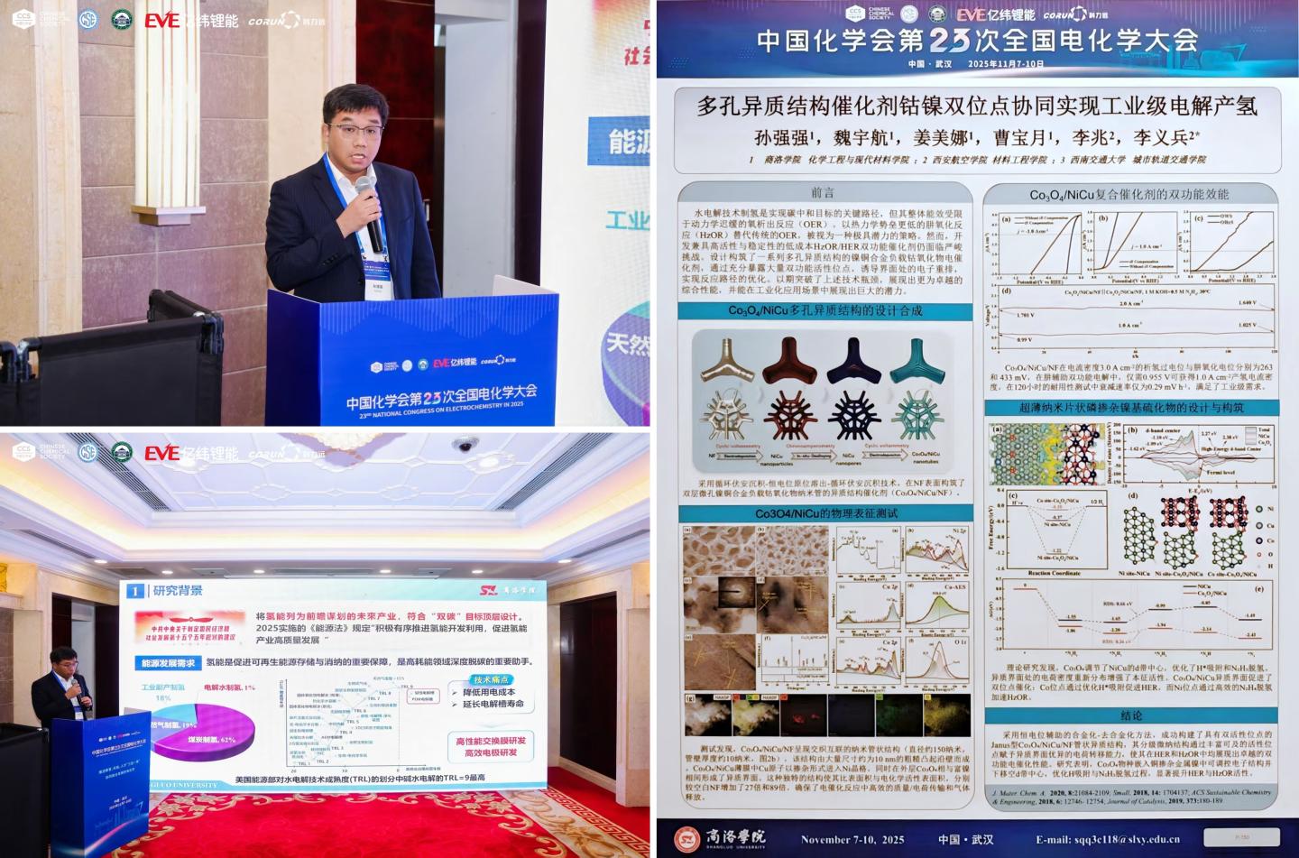 在大会“电催化”分会场,公司教师孙强强以“镍铜基多孔异质结构催化剂多位点协同高效产氢”为题作主旨报告,深入剖析了氢能产业发展背景下电解水制氢的技术瓶颈与解决方案。除口头报告外,孙强强老师还以“多孔异质结构催化剂钴镍双位点协同实现工业级电解产氢”为题展示主旨墙报,发布了团队最新研究成果——Co3O4/NiCu/NF复合催化剂,该成果针对工业级电解产氢的高电流密度需求,实现了性能与稳定性的双重突破。